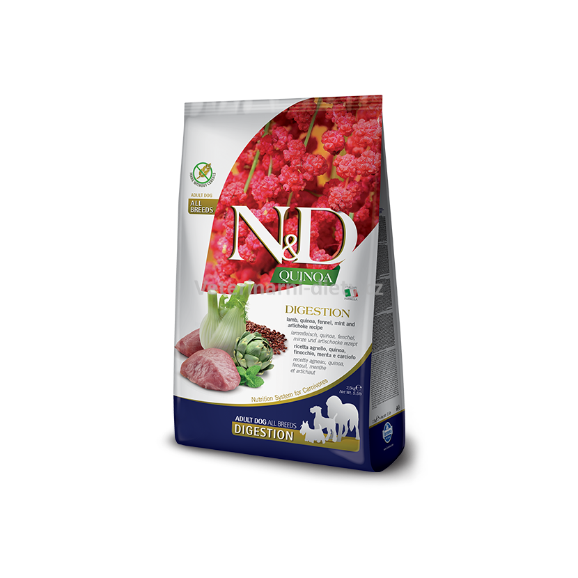 Farmina N&D Quinoa Digestion Lamb & Fennel je krmivo pro zvláštní účely výživy určené k podpoře kompenzace maldigesce a exokrinní pankreatické nedostatečnosti.